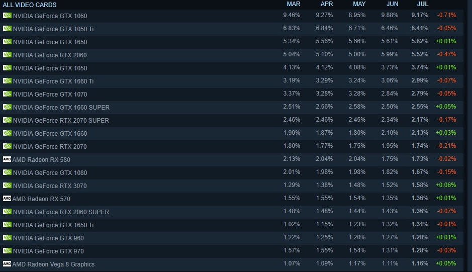 Steam 7 月硬件调查报告:RTX 30 系显卡占比增加