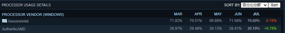 在处理器方面,英特尔的地位依旧不可撼动,其份额为 70.80%,不过 AMD 的份额相比上个月有所提升,来到了 29.19%。