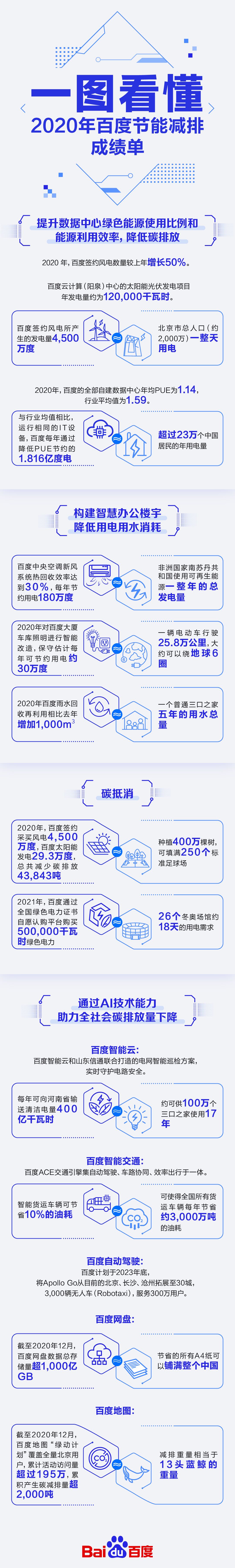 2020年,百度签约采买风电4500万度,较上年增长50%;百度的全部自建数据中心年均PUE为1.14,行业平均值为1.59。与行业均值相比,运行相同的IT设备,百度每年通过降低PUE节约的1.816亿度电可满足超过23万个中国居民的年用电量。