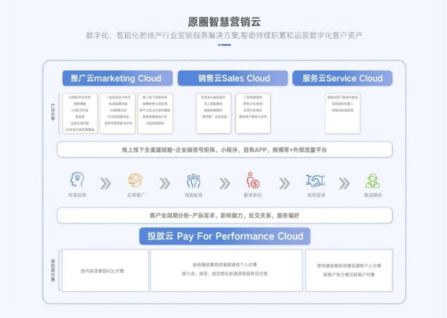 作为最懂地产营销的科技公司,原圈科技产品主要包括两部分,一是智慧营销系统,为客户提供推广、获客、转化,二是获客、管客、跟客的辅助工具。