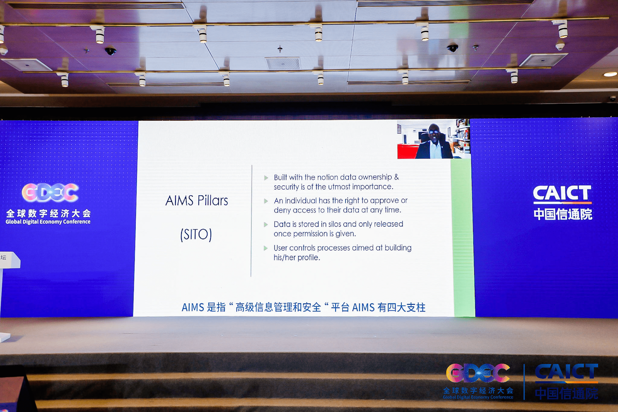Alexander NTOKO通过视频发表题为《数字经济时代的数据主权》的主旨报告,重点介绍数据在网络行为中的关键作用,探讨数据隐私与安全的重要意义,也提到了Advanced information Management and Security(AIM)作为新的数据交互方案与协议在保障数据自主性与独立性的优势。