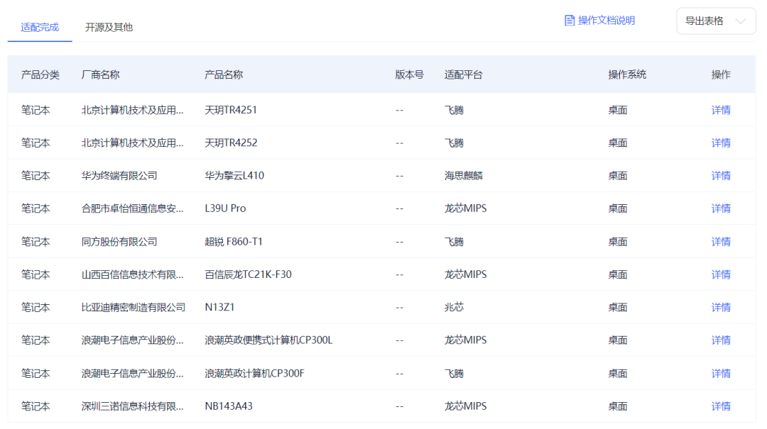 而系统预装少、推广难和用户心理抵触,成了国产桌面操作系统难以推向大众市场的现实问题。在统信官网的“生态适配清单”里可以看到,在笔记本类别里显示“适配完成”的产品中,大多数产品都比较“冷门”,支持的也都是龙芯、麒麟、兆芯等平台,不是市面上常见的电脑品牌和处理器型号。