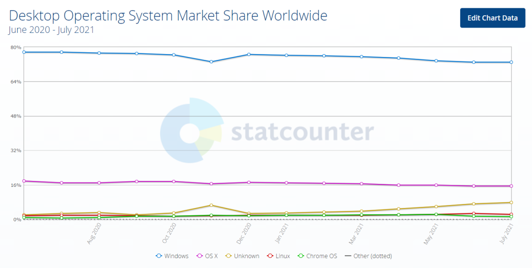 目前的国产桌面操作系统并不是大多数人的选择,根据网站通讯流量监测机构 StatCounter 的数据,在 2021 年 7 月桌面操作系统全球份额中,Windows 和 OS X(macOS)排名前两位,两者市场份额合计超过 88%。从数据来看,尽管 Windows 的市场份额有所下降,但依旧稳稳占据市场第一的宝座,而 Linux 份额仅有 2.38%,在列表中之所以还未看到国产桌面操作系统,其中的因素就包括系统预装和软件生态两个方面。