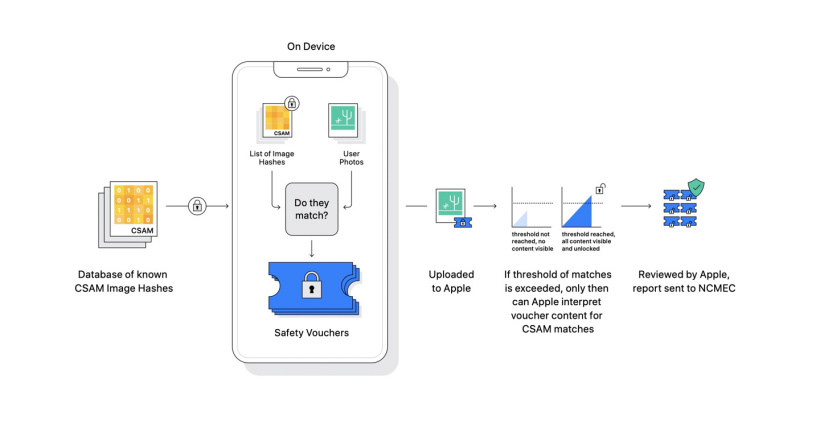 在图片存储到苹果公司的 iCloud 服务之前,该公司会将图片的“哈希”与美国国家失踪与受虐儿童中心(以下简称“NCMEC”)提供的散列数据库进行比对。苹果公司表示,这个数据库将从该公司发布 iOS 15 更新时开始启用,以 iOS 代码的形式发布。匹配过程将在用户的 iPhone 上完成,而不是在云端。