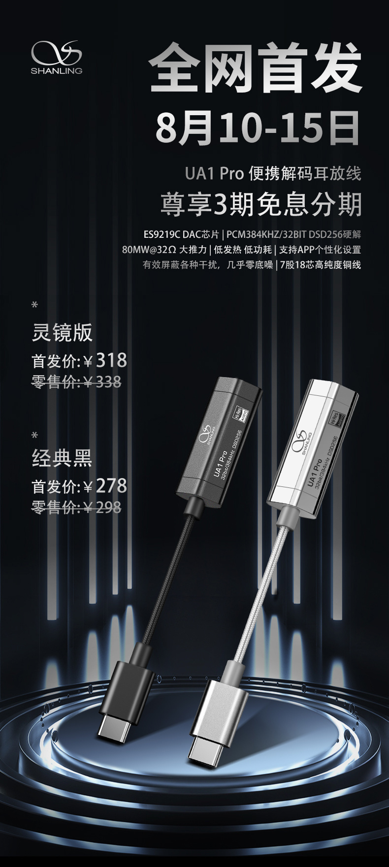 8 月 7 日消息 近日山灵音响正式发布了 UA1 Pro 系列解码耳放小尾巴。这款产品体用经典黑、灵境版可选,使用全金属外壳、Type-C 接口,将于 8 月 10 日首发,到手价 278 元起。