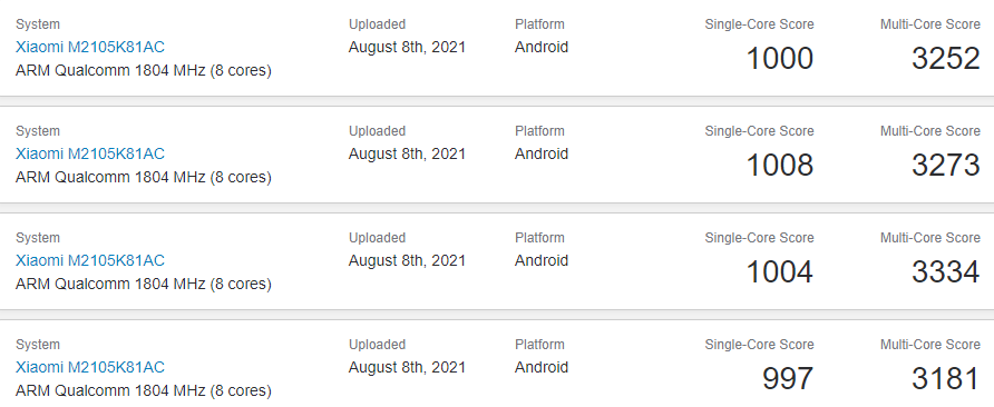 从跑分情况来看,该机型号为 M2105K81AC,搭载八核的骁龙 870 芯片,辅以 Adreno 650 GPU,配备 6GB 内存,运行 Android 11。