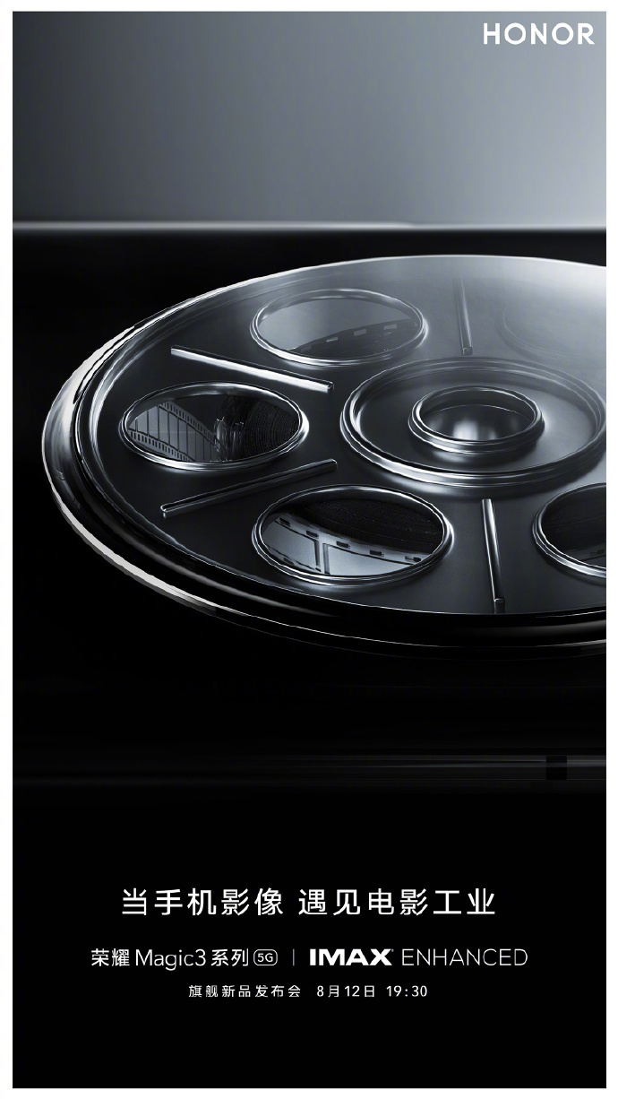 今天荣耀手机官方宣布,当手机影像,遇见电影工业。荣耀 Magic3 系列携手 IMAX ENHANCED 带来电影大师级影像体验。海报曝光了荣耀 Magic3 系列的圆环相机镜头设计。