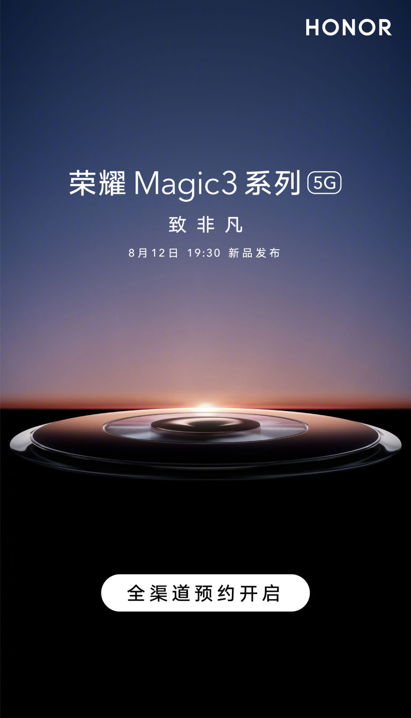 8 月 6 日消息 荣耀 Magic3 系列已经在荣耀线下门店、各电商平台同步开启全渠道预约,该机将于 8 月 12 日 19:30 发布。