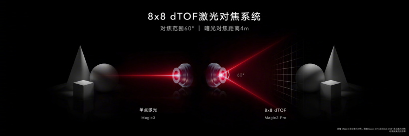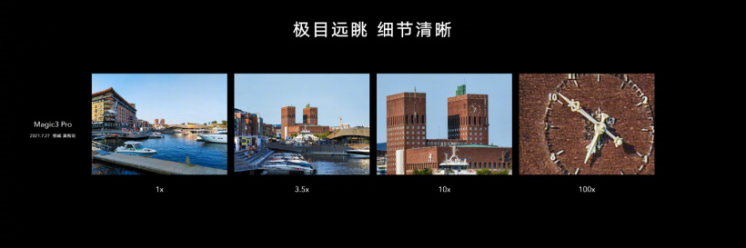 荣耀 Magic3 Pro 搭载 6400 万潜望式长焦摄像头,3.5 倍光学变焦,10 倍混合变焦,100 倍数字变焦,支持 OIS 光学防抖和 8*8 dToF 激光对焦系统。