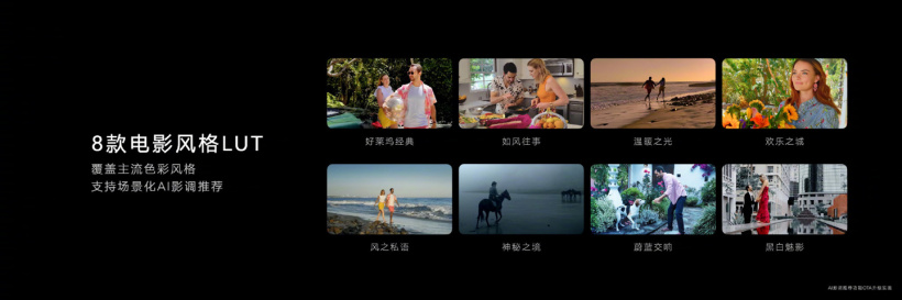 荣耀深度定制的 10 bit Magic-Log 格式,支持风格化的 3D LUT,以及 AI 影调推荐,是业界首次端到端支持电影工业视频流程,官方提供了大师定制的 8 款电影风格 LUT。