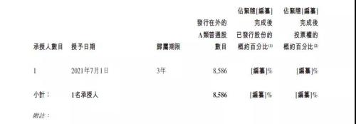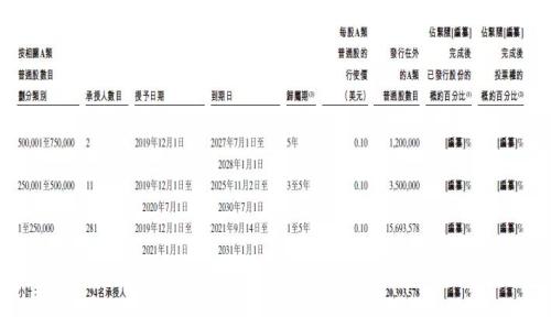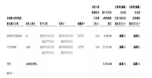 「2019年计划」所能授出的最大奖励数目为1.41亿股A类普通股,其中可以购股权形式授出的最大奖励数目为1.23亿股。截至最后可行日期,理想汽车已根据该计划向297名公司员工授出共计5.6千万股的A类普通股购股权,行权价为每股0.1美元,在最后可行日期至上市日期间,理想汽车将不再授出任何奖励。下表为理想汽车根据「2019年计划」向公司员工(非董事及高管)所授出的未行使购股权详情。