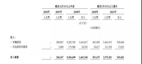 根据招股书中披露的财务数据,理想汽车于2019年12月正式交付第一辆理想ONE时开始确认车辆销售收入,其收入总额由2019年的2.84亿元快速增至2020年的94.57亿元,在2020年第一季度中,理想汽车的收入为8.52亿元,这一数额在2021年第一季度中增至35.75亿元。其中,车辆销售仍然是理想汽车最主要的收入来源,随着公司业务的不断发展成熟,其他销售和服务的收入占比也在逐渐提升。