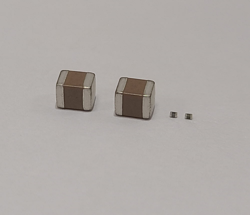 这两种 MLCC 电容一个为 0603 规格(0.6mm 长,0.3mm 宽)100nF 容量,另一个为 3216 规格,容量 47μF。