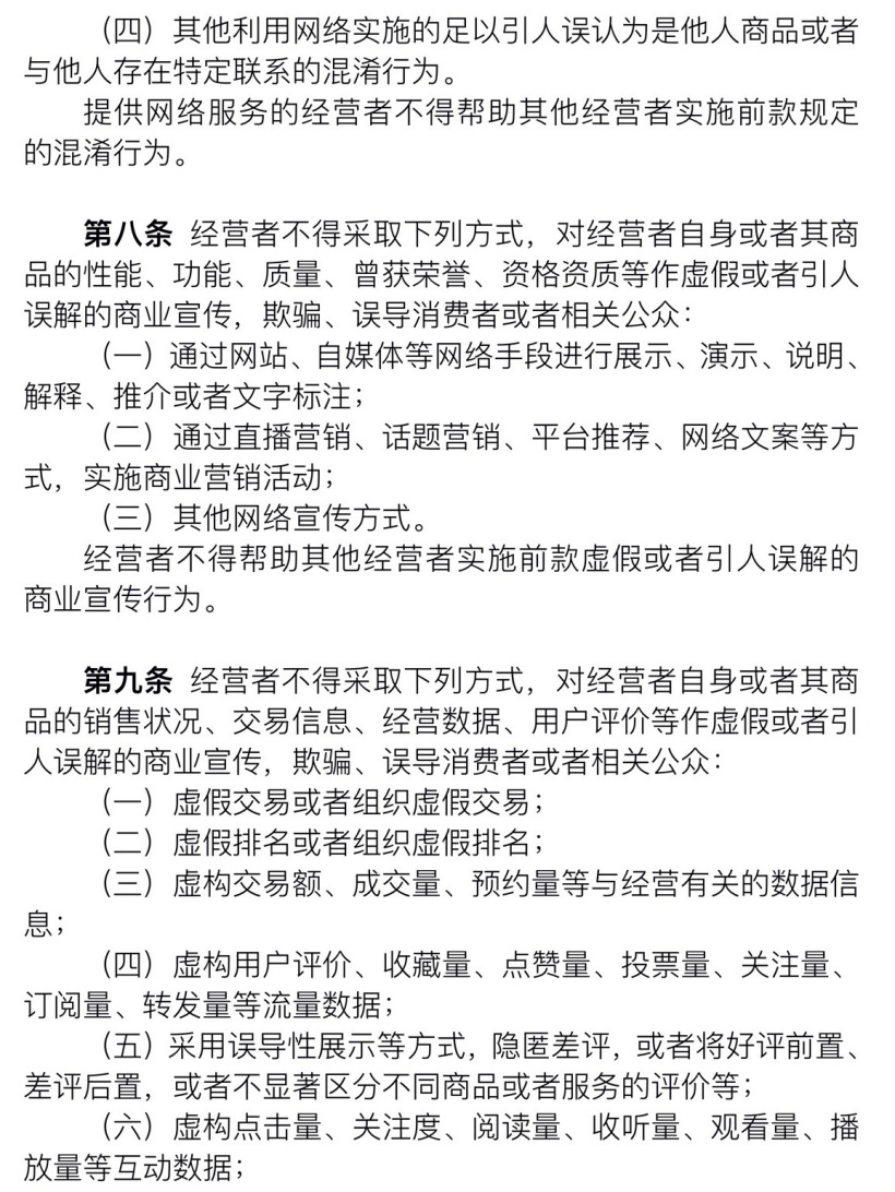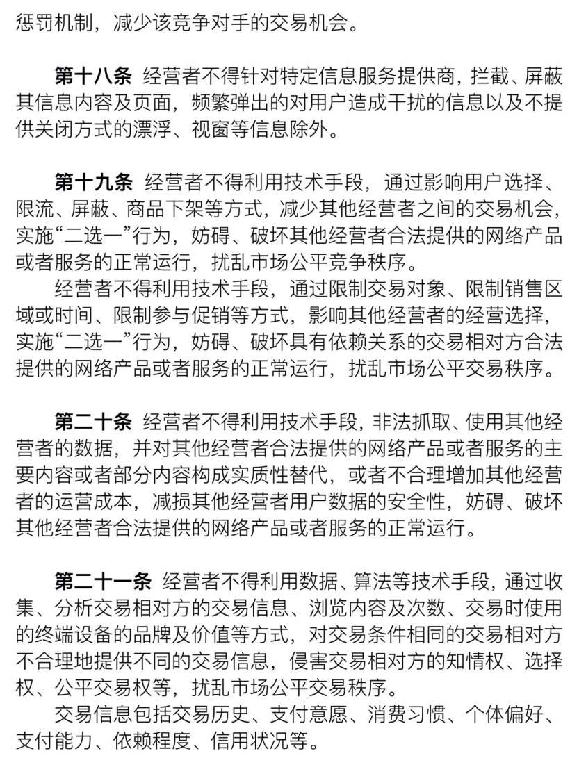 经营者不得利用技术手段,通过影响用户选择、限流、屏蔽、商品下架等方式,减少其他经营者之间的交易机会,实施“二选一”行为,妨碍、破坏其他经营者合法提供的网络产品或者服务的正常运行,扰乱市场公平竞争秩序。
