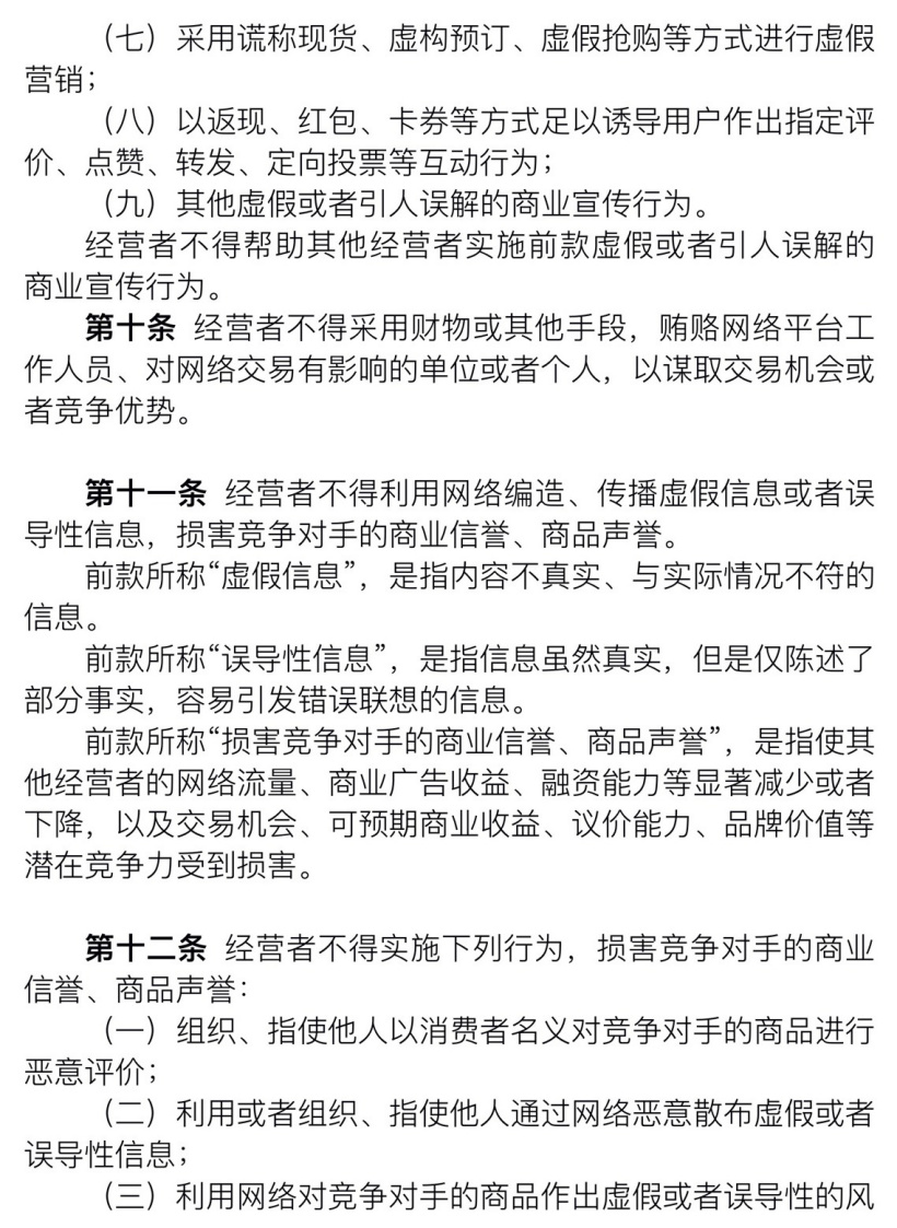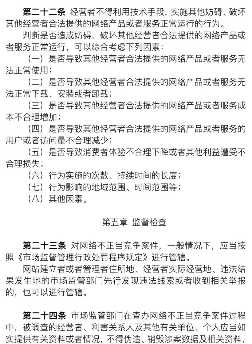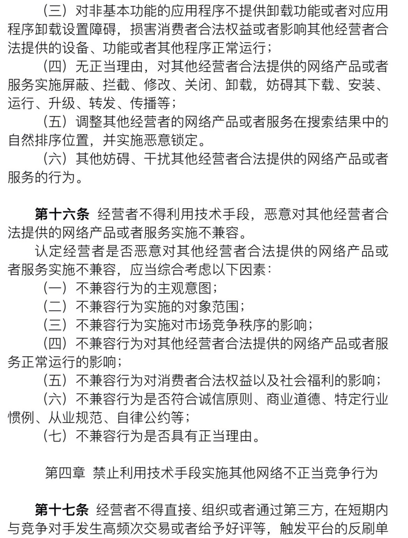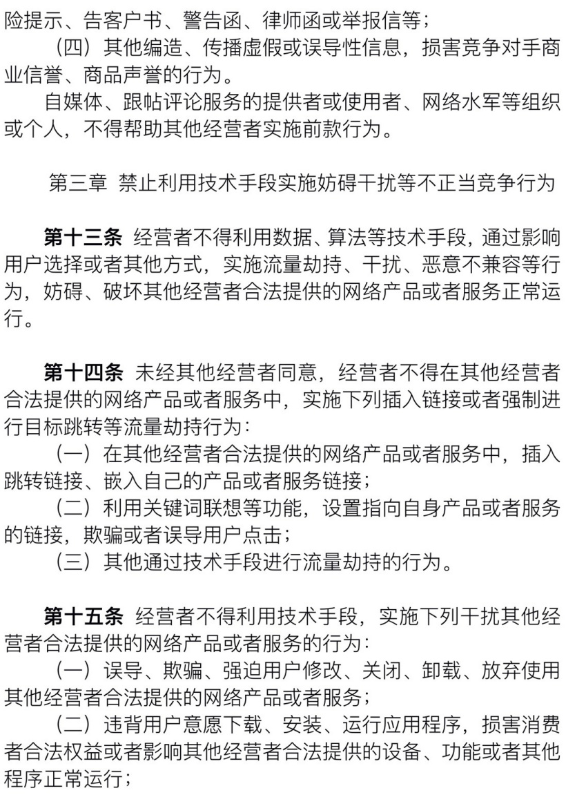 《规定》中提出,经营者不得利用数据、算法等技术手段,通过影响用户选择或者其他方式,实施流量劫持、干扰、恶意不兼容等行为,妨碍、破坏其他经营者合法提供的网络产品或者服务正常运行。