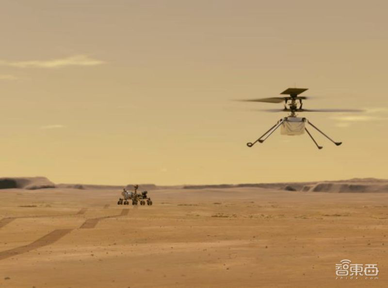 ▲“机智号”无人机(右)和“毅力号”火星探测器(左)