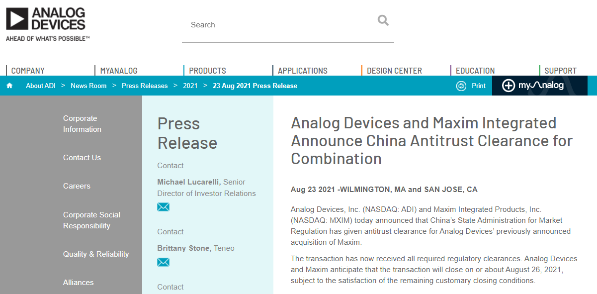 8 月 24 日消息 昨日,半导体制造商 Analog Devices(简称 ADI)与 Maxim Integrated Products(简称 Maxim)宣布,ADI 公司此前公布的收购 Maxim 公司的交易已经获中国国家市场监督管理总局反垄断许可。