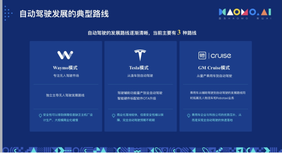 顾潍灏将“长城+毫末”模式直接对标“通用汽车+Cruise”,而毫末就是中国的Cruise。他表示,当前全球自动驾驶行业主要有三种发展模式,一种以谷歌Waymo、百度等科技公司为代表,第二种以特斯拉、理想、蔚来等新能源主机厂为代表,第三种的代表是通用汽车+Cruise,毫末智行正是这一模式在国内自动驾驶行业中的典型代表。“三条典型路线,从现在估值的角度来讲(特斯拉自动驾驶是它整个市值的一部分),第三条路线Cruise的估值最高。”