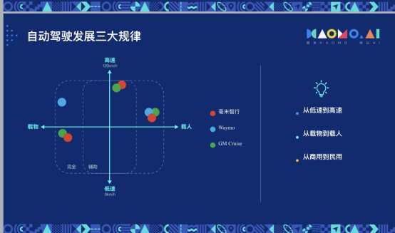毫末智行的快速成长,得益于聚焦商业化、快速完成自我造血。结合自动驾驶的竞争场景,顾潍灏把行业“战场”从载物到载人、从低速到高速为4个象限,加上“有人辅助”的中间区域,以及完全的“无人驾驶”几个象限。“我总结了自动驾驶正常商业化的三个规律,从低速到高速,从载物到载人,从商用到民用。”因此,毫末智行选择“Cruise模式”,先做辅助自动驾驶,然后又做Robo taxi,聚焦运输行业的无人物流车,并快速获得了美团、物美等行业巨头的订单与投资。