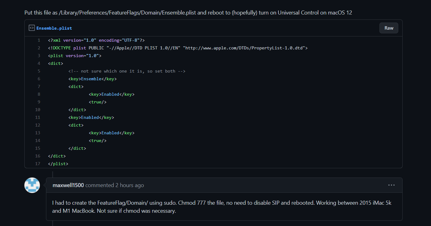 但是,在 8 月 13 日发布的最新 macOS Monterey Beta 5 测试版中,通用控制已可手动开启。按照 GitHub 中给出的教程,需要使用 sudo 管理员命令创建 Ensemble.plist(权限可能需要改为 777,或者进行重启),之后就可以使用通用控制了。