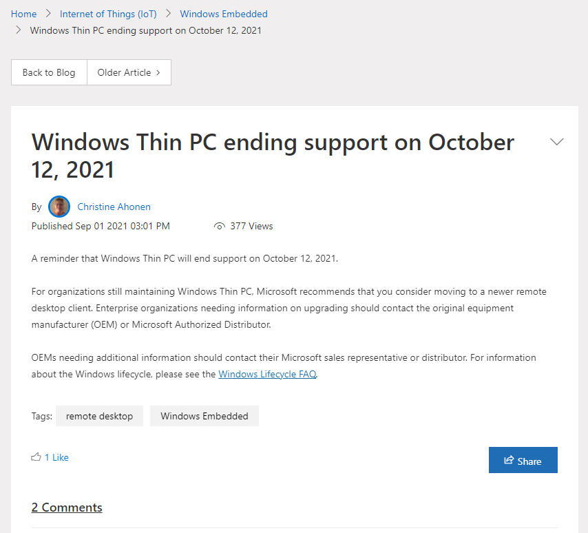 9 月 2 日消息 微软今日发布通知,表示将于 2021 年 10 月 12 日起,停止对于 Windows Thin PC 操作系统的支持。对于仍在使用这一系统的组织,微软建议将业务迁移到新的远程桌面客户端。需要升级的企业,请联系 OEM 厂商或者微软认证的分销商。
