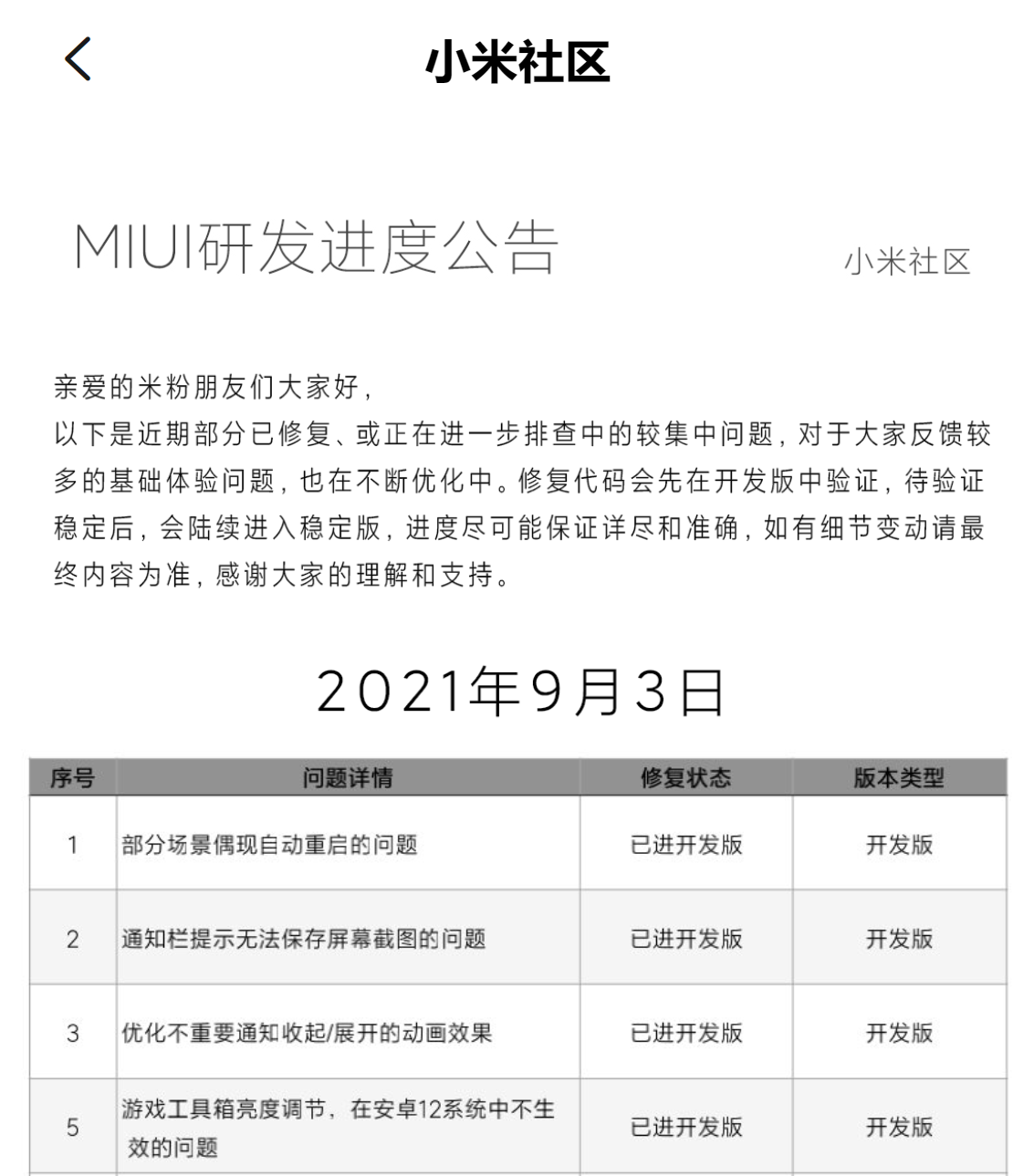 9 月 4 日消息 据小米社区消息,今日小米正式推出了新的聚合专题 ——MIUI 研发进度公告。这一页面将汇聚大家最为关心的问题研发进度,同时公开哪个版本中修复的内容。