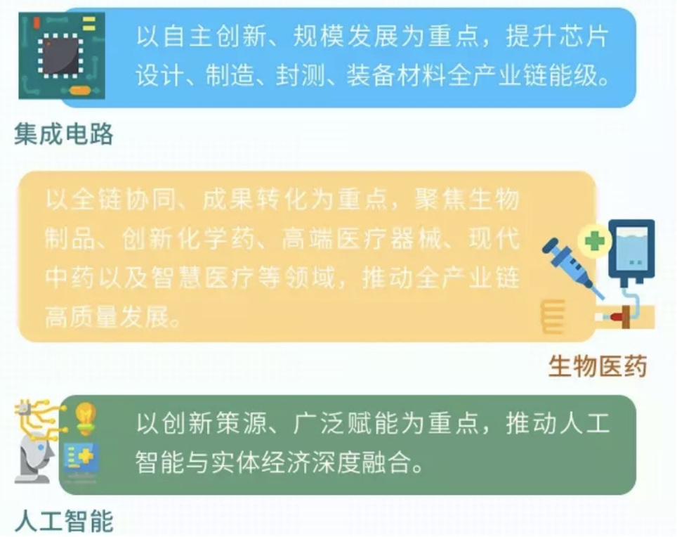 《规划》中明确未来以集成电路、生物医药、人工智能三大先导产业为引领,大力发展电子信息、生命健康、汽车、高端装备、先进材料、时尚消费品六大重点产业,构建“3+6”新型产业体系,打造具有国际竞争力的高端产业集群。
