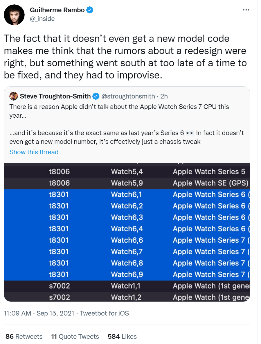 现在,开发者 Steve Troughton-Smith 根据最新版本的 Xcode 确认,Apple Watch Series 7 与去年的 Apple Watch Series 6 拥有完全相同的 CPU。