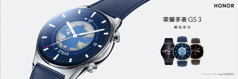 荣耀手表 GS 3 有“环球远航”、“流光经典”、“竞速先锋” 三款配色,分别对应三种不同的手表风格。