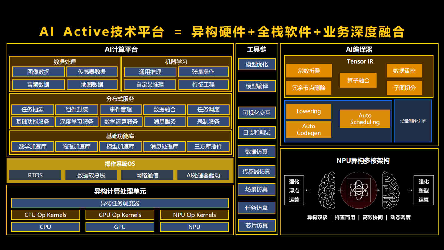 平台底层是异构硬件,异构多核的 NPU 架构为不同类型的算法提供了足够的灵活度和优异的能效。AI 编译器将前端框架工作负载直接编译到硬件后端,充分使用现有的硬件资源,兼顾存储和效率,降低开发者的开发难度。AI 计算平台和工具链,则为开发者提供了良好的开发环境。