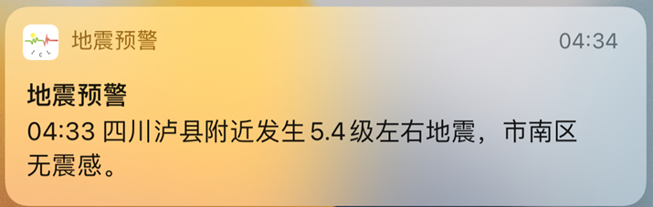 昨日 4 时 33 分,四川泸县发生 6.0 级地震,由成都高新减灾研究所自主开发的地震预警接收软件“地震预警”App 也向用户发送了提醒。