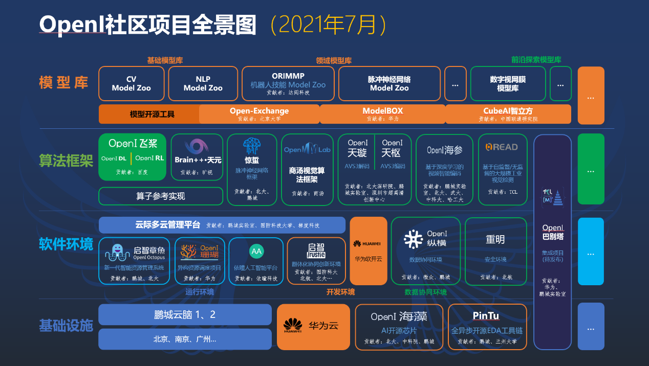 开源项目方面,启智社区已吸引26个优质开源项目进驻进行孵化,形成从基础设施、软件与数据环境与算法框架的多层次开源技术体系(如下图所示)。在基础硬件方面,社区拥有可配置指令集和微架构的AI开源芯片项目启智海藻,以及面向FPGA/ASIC的全异步开源EDA工具项目启智拼图。在软件环境方面包含AI集群管理和资源调度系统启智章鱼、业内首个基于昇腾芯片和鲲鹏芯片的商用级开源人工智能平台启智依瞳、面向大规模AI开发者协同开发的启智磐石项目,以及AI开源算法评测加固的启智重明等。在基础算法框架方面,社区吸引了百度自主研发、开源开放、功能完备的产业级深度学习平台启智飞桨项目,旷视自主研发的训练推理一体深度学习框架启智天元项目,以及由商汤贡献的算法体系最完备的计算机视觉框架OpenMMLab项目。此外,社区还发布了基于AVS3标准的编解码器开源项目启智天枢与天璇项目、TCL集团工业研究院研发的业界第一个工业视觉无监督异常检测框架启智READ项目,以及面向脉冲神经网络、计算神经科学、类脑计算等前沿科学研究的启智惊蜇与启智灵机开源项目。在开源算法与模型方面,启智社区拥有面向AI模型压缩、转换、自动化服务封装、发布、共享、端边云部署等功能于一体的开源工具集,已孵化当前中文自然语言处理领域最前沿的开源大模型鹏程·盘古与悟道模型。