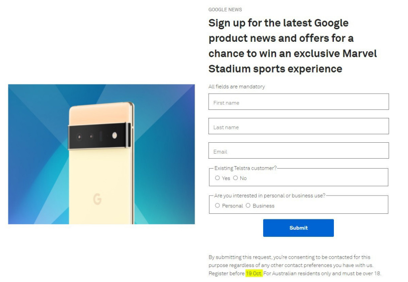 据 gsmarena 报道,澳大利亚电信运营商 Telstra 在 Facebook 上发布了一则 Pixel 6/Pro 的广告,同样出现了 10 月 19 日的字样,它说“全新的谷歌 Pixel 6/Pro 即将推出”,并要求用户登记对此次发布的兴趣,以获得赢得礼品的机会。