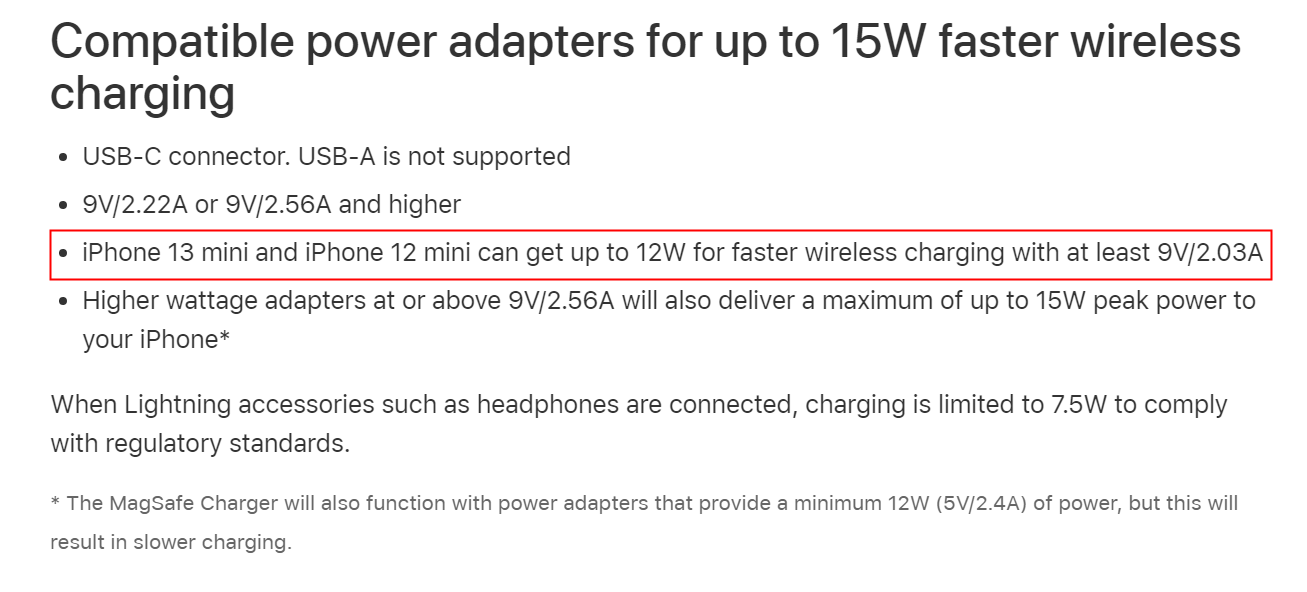 迷你尺寸的 iPhone 机型电池较小,因此 iPhone 12 mini 或 iPhone 13 mini 的峰值功率为 12 瓦,通过 MagSafe 充电到满电的时间可能不会比限制为 15 瓦的 iPhone 13 更长。