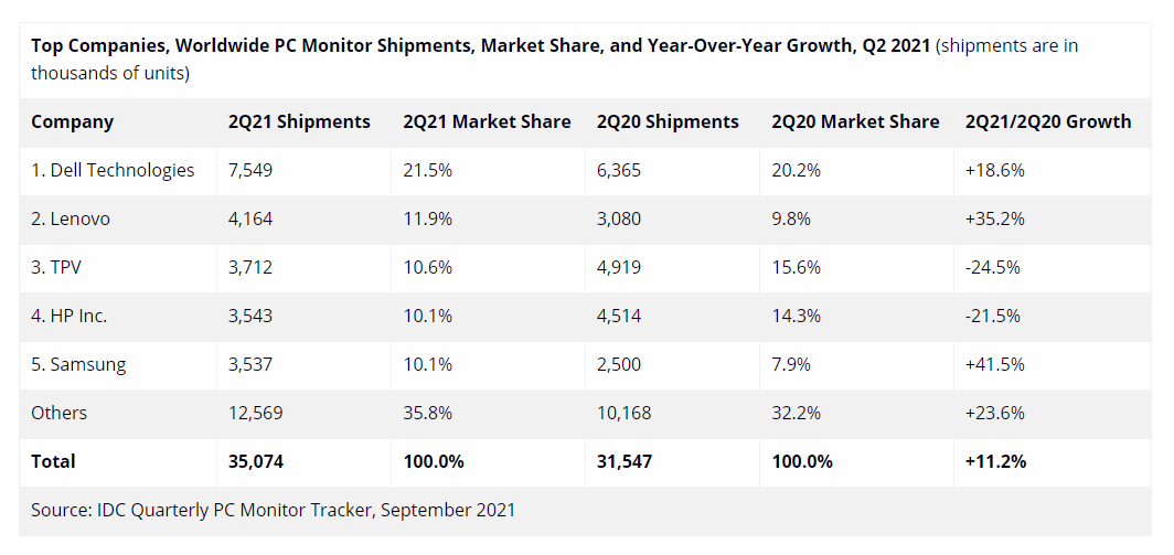 IDC:第二季度全球 PC 显示器出货超 3500 万台,同比增长 11.2%
