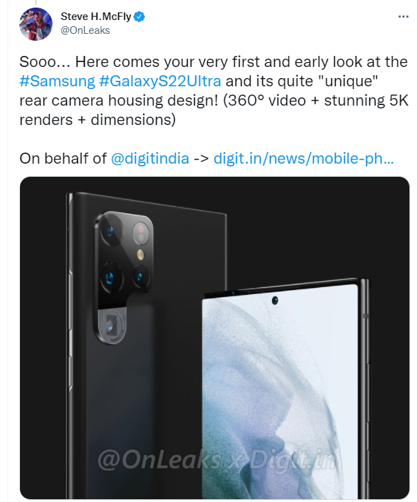 ▲ Galaxy S22 Ultra 渲染图,由 Digit 与爆料者 OnLeaks 合作制成