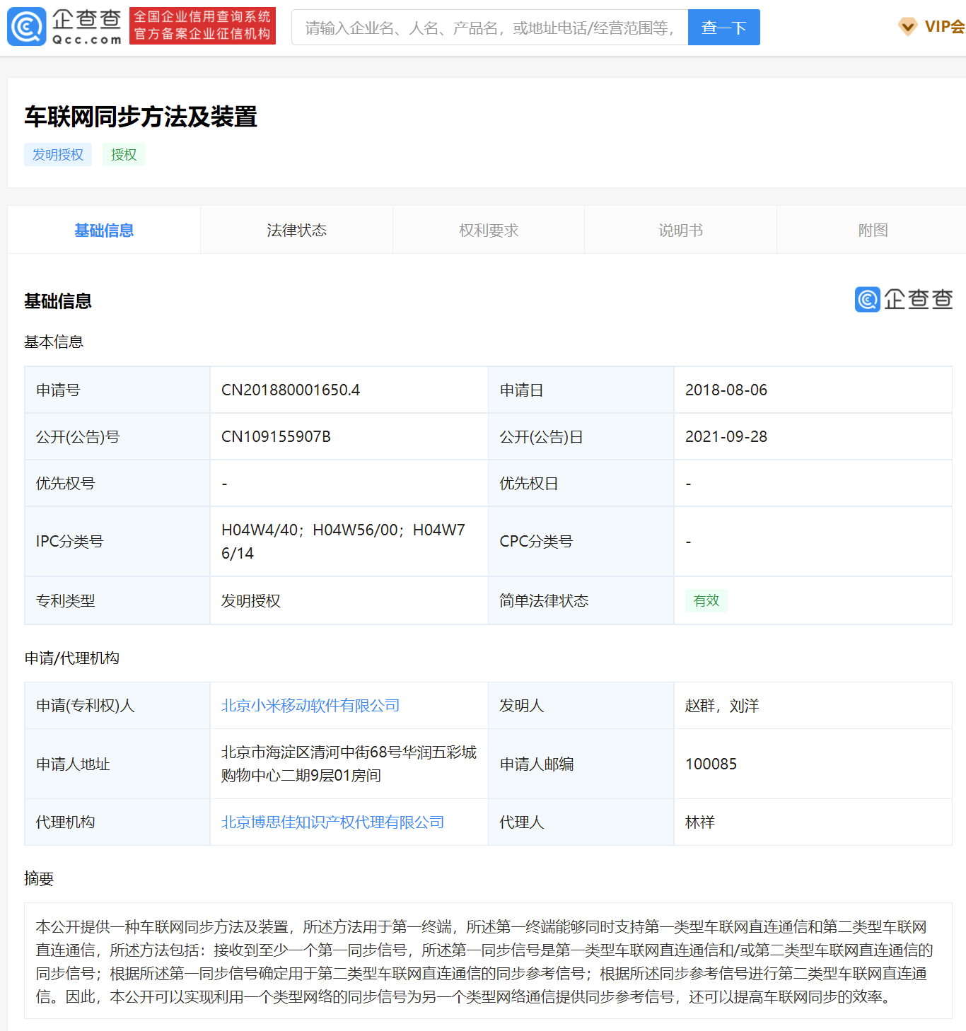 小米车联网专利获授权,可为不同类型网络提供同步参考信号
