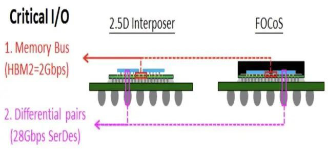 ▲ 高性能计算封装的不同选项:2.5D 与 FOCoS