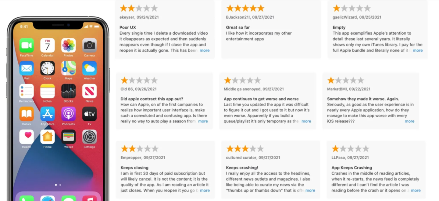 9 月 30 日消息 在很长的一段时间里,苹果 App Store 都不允许用户对苹果 iPhone 和 iPad 内置的 App(如邮件、音乐、新闻、股票和计算器)等进行打分或评论。然而,自本月早些时候 iOS 15 发布以来,苹果似乎已经解除了这一限制。