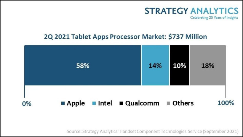 9 月 29 日消息 今日中午,Strategy Analytics 发布报告称,2021 年 Q2 平板电脑应用处理器市场收益增长 17%,达到 7.37 亿美元。
