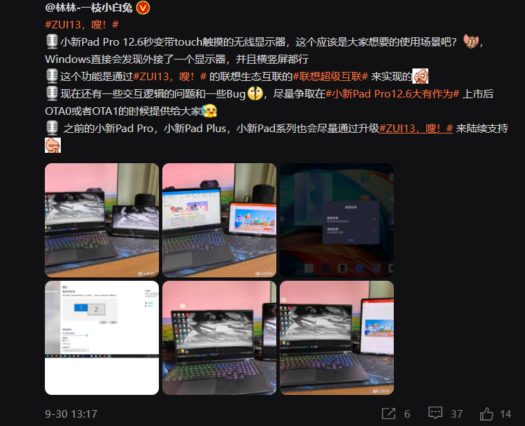 此外,林林透露,目前的 PC 副屏功能还有一些交互逻辑问题和 Bug,尽量争取在小新 Pad 12.6 上市后通过 OTA 提供,之前的小新 Pad Pro、小新 Pad Plus、小新 Pad 系列也将尽量支持。