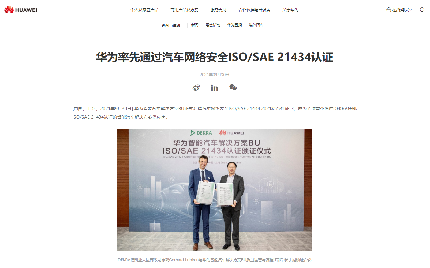 9 月 30 日消息 据华为官网消息,华为智能汽车解决方案 BU 正式获得汽车网络安全 ISO/SAE 21434:2021 符合性证书,成为全球首个通过 DEKRA 德凯 ISO/SAE 21434 认证的智能汽车解决方案供应商。