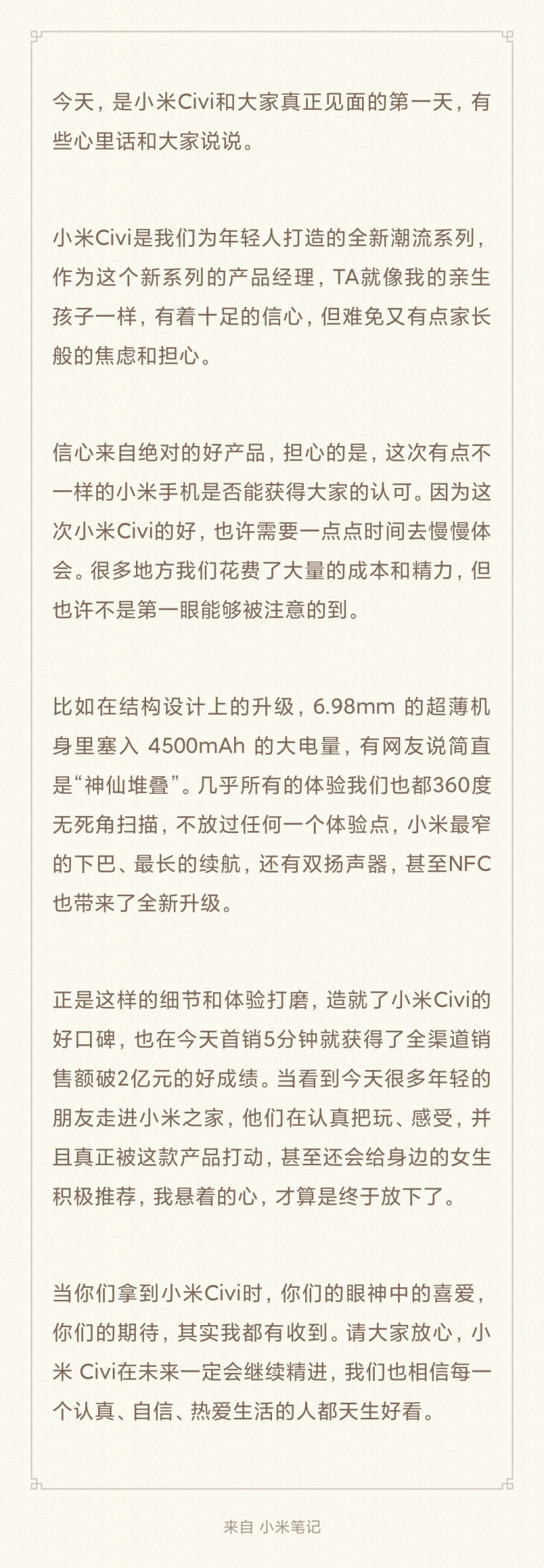 小米 Civi 首销 5 分钟,全渠道销售额突破 2 亿元