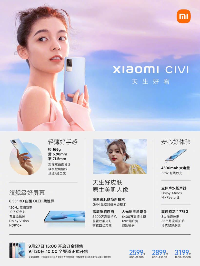 影像方面,小米 Civi 配备 6400 万像素高清主摄。手机提供像素级肌肤焕新技术,采用了 GAN 生成对抗网络技术,经过百万级别的训练,在美颜的同时保留肌肤真实纹理,对美人痣、小酒窝等个性化细节进行识别保留。
