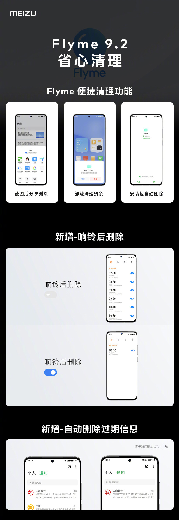 Flyme 9.2 带来了省心清理功能。「响铃后删除」,闹钟在响铃后自动删除,自动清理临时闹钟。「自动删除过期信息」,智能分辨验证码和取件码,过期自动删除。省心清理还提供自动删除截图、安装包和残余文件等清理方式。