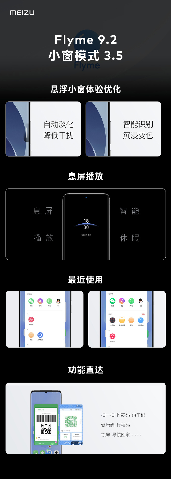 功能升级方面,Flyme 9.2 带来小窗模式 3.5,贴边把手自动淡化、沉浸变色,减轻视觉干扰,优化悬浮小窗使用体验。支持「息屏播放」,息屏也能继续听声音;「最近使用」,快速找到应用,让操作更轻松;「功能直达」,轻轻一划,就能快人一步。