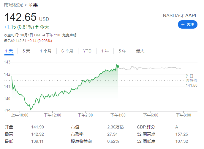 常规交易中苹果股价上涨 1.15 美元,涨幅为 0.81%,报收于 142.65 美元。