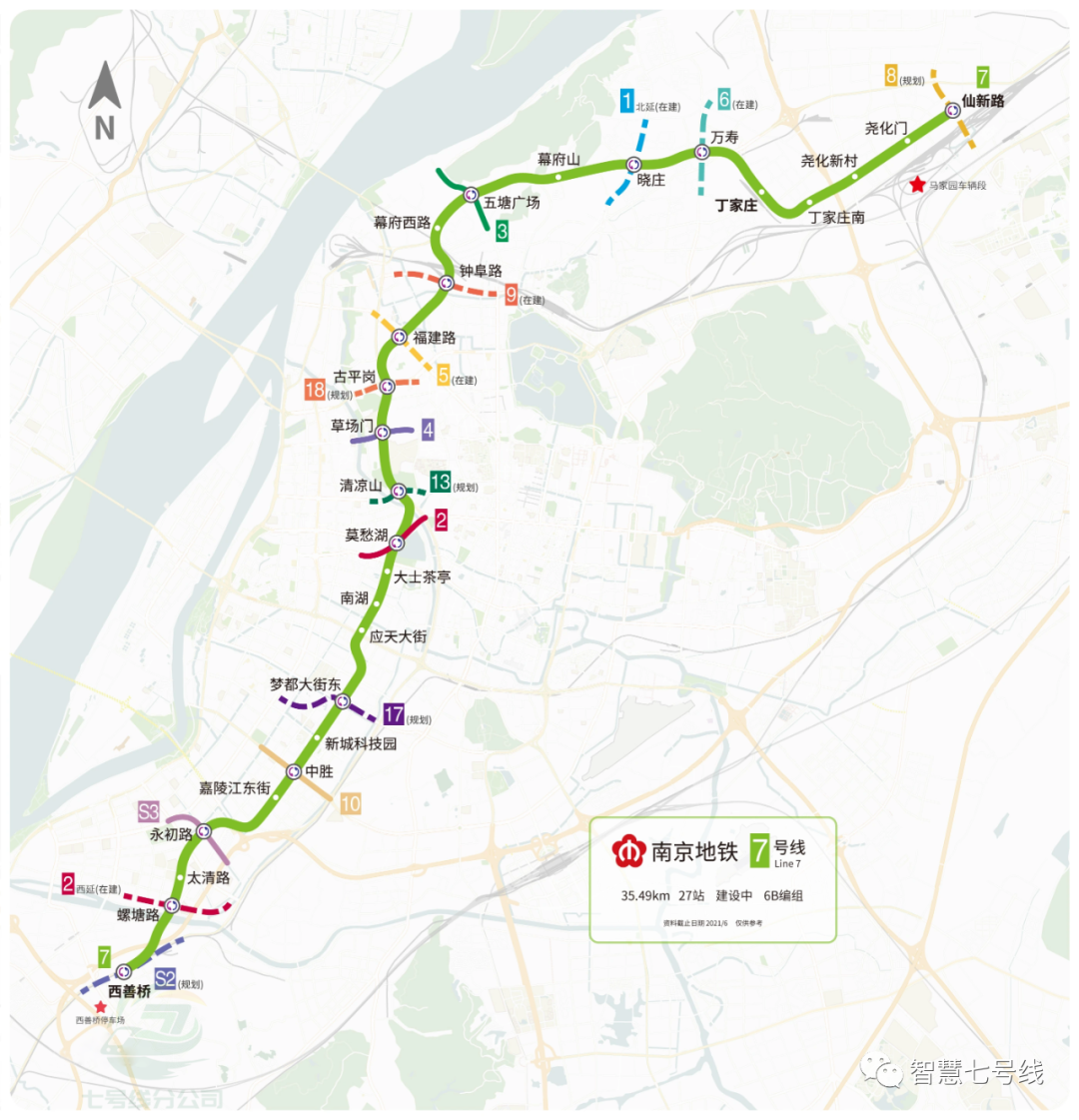 南京地铁 7 号线于 2017 年 11 月 29 日正式开工,是南京地铁线网中一条东北至西南走向的线路。地铁 7 号线全长 35.49km,全线均采用地下敷设方式,设站 27 座,含换乘站 15 座,平均站间距约 1.35km。