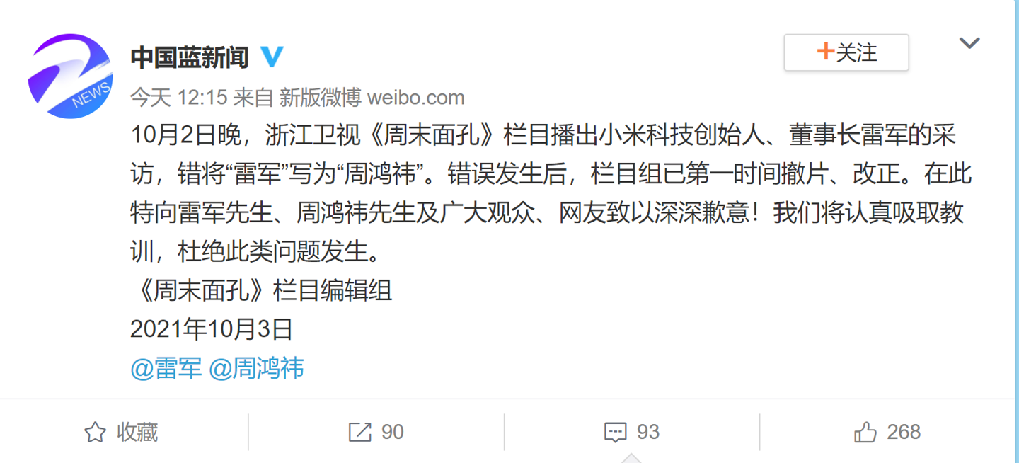10 月 2 日晚,浙江卫视《周末面孔》栏目播出小米科技创始人、董事长雷军的采访,错将“雷军”写为“周鸿祎”。错误发生后,栏目组已第一时间撤片、改正。在此特向雷军先生、周鸿祎先生及广大观众、网友致以深深歉意!我们将认真吸取教训,杜绝此类问题发生。