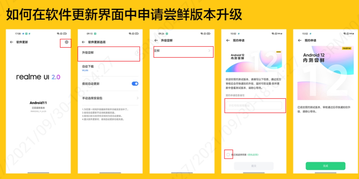 realme GT 5G 手机的 Android 12 尝鲜版内测招募已于 10 月 5 日 10:00 起开启报名,报满为止。具体升级步骤参考以下指导: